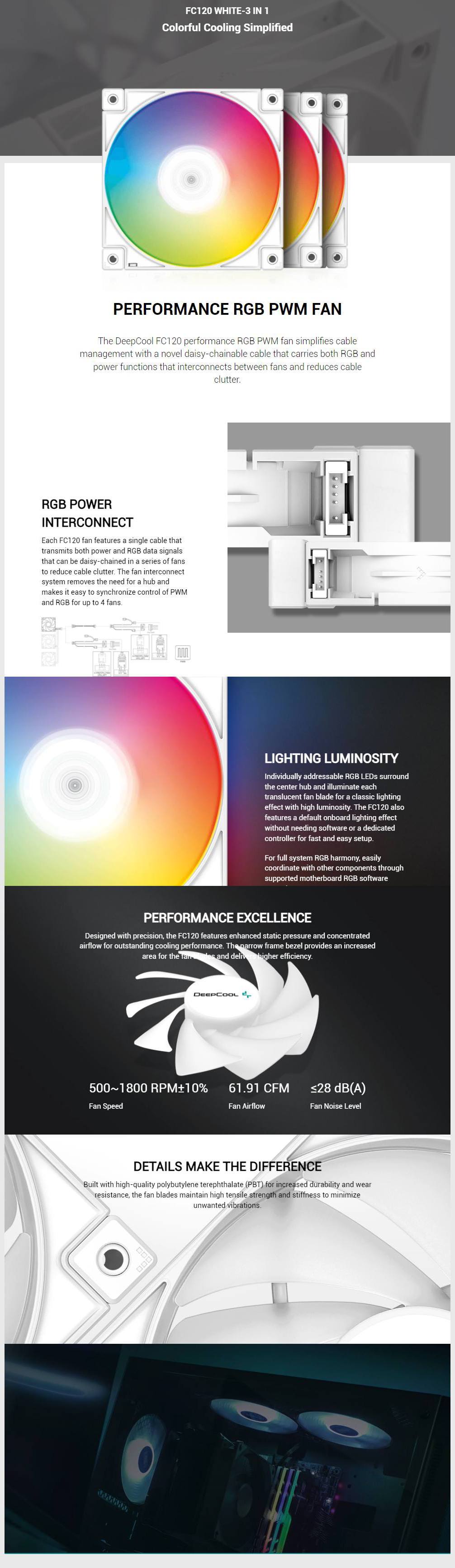 FC120 WHITE-3 IN 1 3 x 120mm, ARGB LEDs, 1800 RPM, 61.91 CFM, 28 dBA, Cooling Fans The DeepCool FC120 performance A-RGB PWM fan simplifies cable management with a novel daisy-chainable cable that carries both A-RGB and power functions that interconnects between fans and reduces cable clutter.